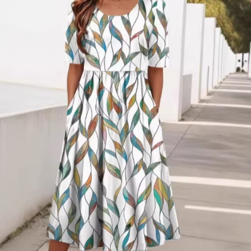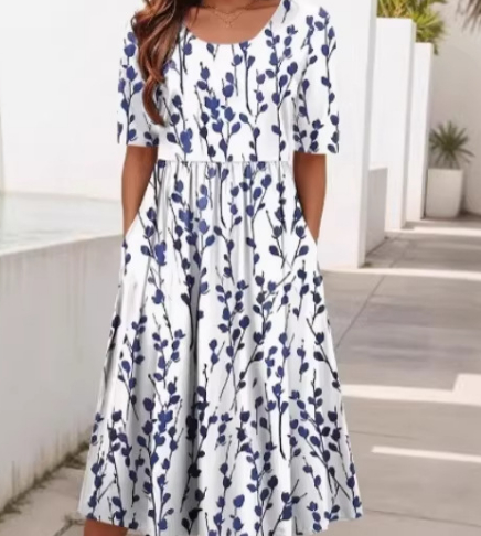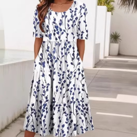 Womens Round-Neck Mid-Waist Printed Swing Dress